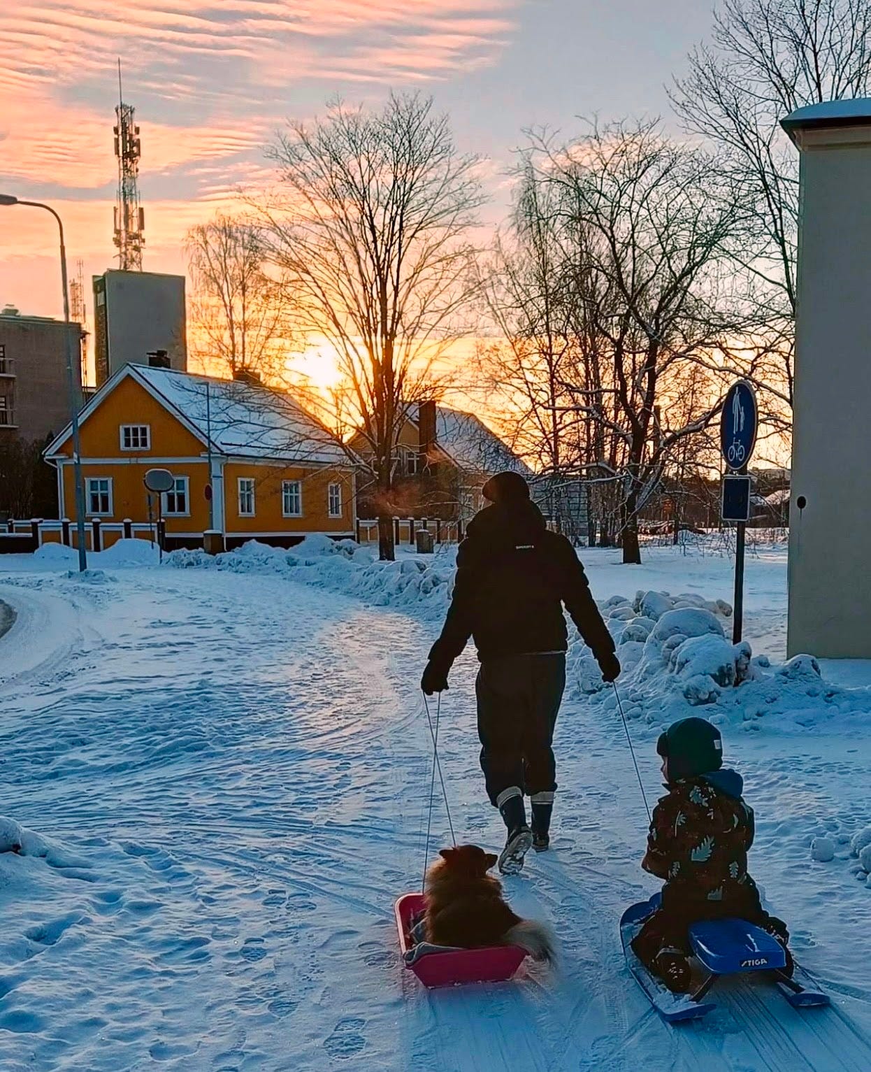 That little gap between the former and latter, however, does tend to leave the sidewalks still covered for the school run. This is why during these snowiest of days you will often see small children being casually dragged to school on sheets of hard plastic known here as pulkka.